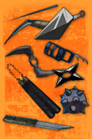 As armas “descartáveis” que os ninjas usam geralmente ficam guardadas nos bolsos dos coletes ou na sacola amarrada à perna. Alguns as prendem por dentro da roupa.